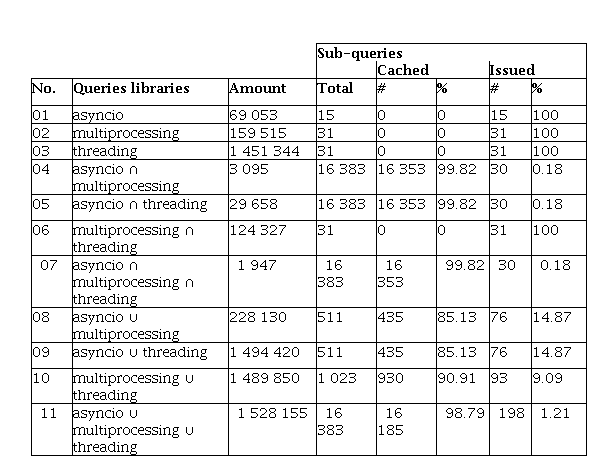 In this case, the queries ask for the amount of source codes that use the classical synchronization mechanisms defined in the asyncio, multiprocessing and threading Python libraries.