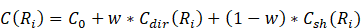 (1)Donde Cdir(R.) denota la no homogeneidad entre los elementos direccionales pertenecientes a R.. Csh(R.) denota la irregularidad de la región R.; w ∈ [0,1] constituye un valor de peso, y C. es el valor umbral correspondiente al costo definido para una región a la cual pertenezca un solo elemento.