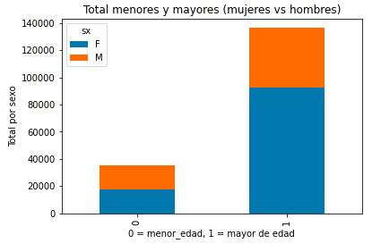 Se genera un gráfico de barra mostrando el número de hombres y mujeres, agrupados en menor_edad y mayor de edad.