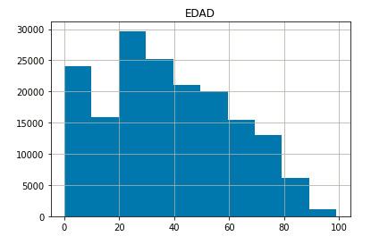 Se genera un gráfico del tipo histograma mostrándonos la distribución de las citas por edades en el rango de 0 a 100 años. Este gráfico permite apreciar los bloques de edades en los que se concentran la mayor cantidad de datos del dataframe.