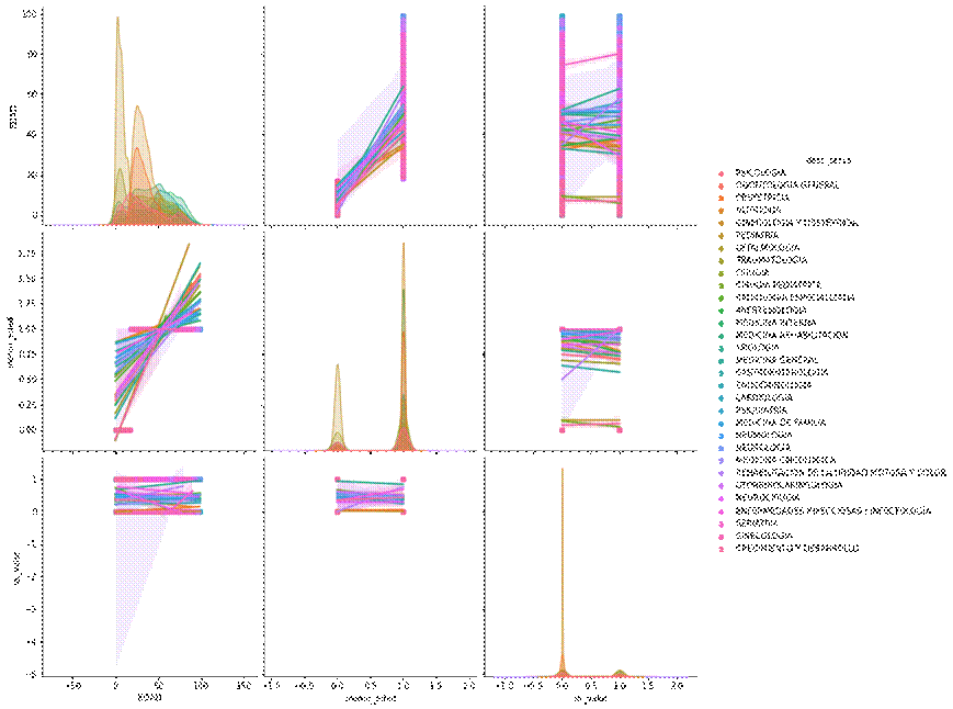 En un primer resultado, luego de evaluar la interrelación de las entradas de a pares, para ver cómo se concentran linealmente las salidas de especialidades médicas por colores, es decir las variables: edad, “menor_edad” que determina si es mayor o menor de edad un paciente, “sx_valor” que agrupa a los mismos en femenino o masculino, se ha podido evidenciar su concentración en base a la clasificación por especialidad médica, representada en la variable “desc_servs”.