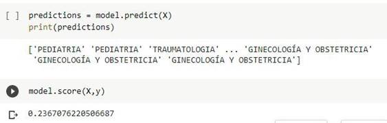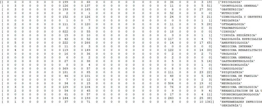 Los datos obtenidos en la matriz de confusión, como se muestran en la siguiente tabla 2, los valores están muy por debajo de la predicción acertada, esto debido a que el modelo de regresión logística tiene una validez de 23.67%, considerando las variables de entrada: sx_valor, edad y menor_edad versus las especialidades médicas.