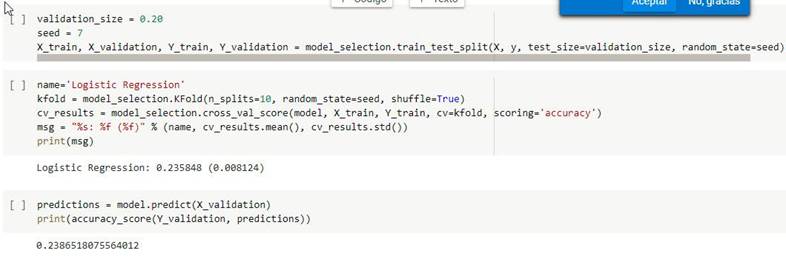 Se crea el modelo de regresión lineal, se entrena con un conjunto de datos que corresponde al 80% del data frame, y posteriormente se testea o valida con el restante 20% del conjunto de data frame.