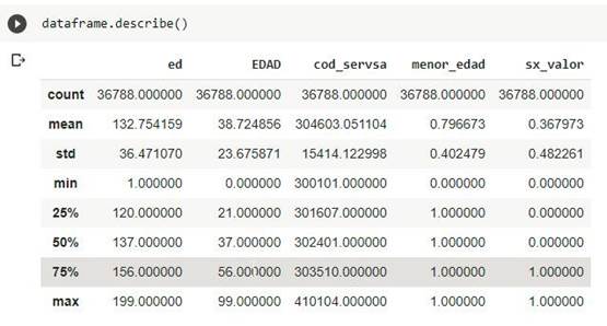 Se procede a presentar la descripción del dataset, lo cual nos da una idea de valores como total de registros, valor promedio, desviación estándar, percentil 25%, percentil 50%, percentil 75%, valor mínimo, valor máximo, para cada columna que forma parte del dataset.