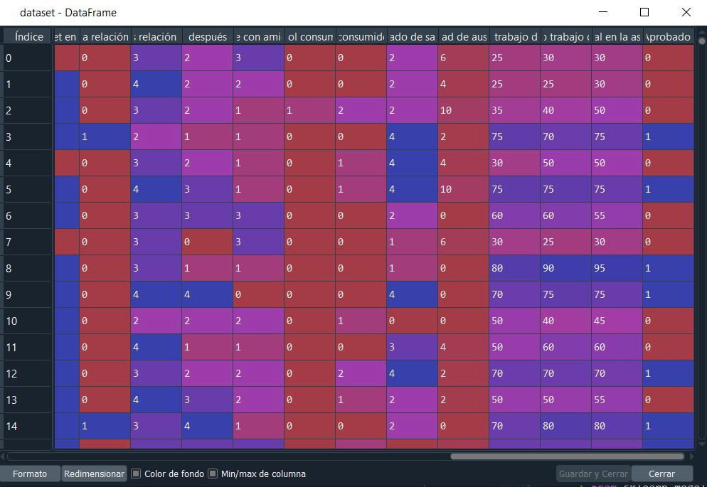 De esta manera, se debe identificar aquellas variables categóricas y no categóricas. Sin embargo, se ha considerado trabajar con Y_1 para la clasificación (desaprobado/aprobado) y Y_2 para la regresión (campo de notas finales).