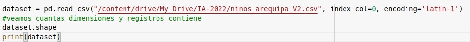 Finalmente se crea un nuevo archivo csv con la información separada. Este nuevo archivo csv llamado “Niños_AREQUIPA_V2.csv” contiene una cabezera con los siguientes datos: 'Diresa', 'DxAnemia', 'Sexo', 'EdadMeses', 'Peso', 'Talla', 'Hemoglobina', 'HBC', 'ProvinciaREN', 'DistritoREN'. y es acompañado por la información que está separado en un array new_data.
