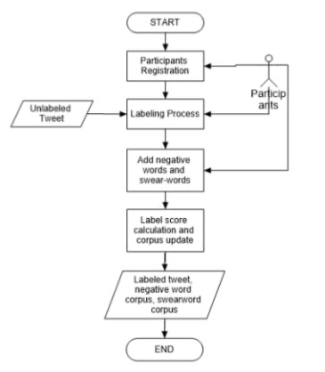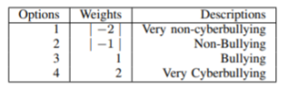 Para este trabajo, estamos utilizando un conjunto de datos de tweets relacionados con el ciberacoso, que habría que analizarlos en profundidad mediante la técnica de Sarna para poder clasificarlos de forma booleano; es decir, los que contengan 0 serán tuits de ciberacoso o de los que se pueda sospechar contienen cyberbullying, los que contengan 1 serán los tweets normales por lo que debemos realizar un sistema de etiquetado que podría utilizar diferentes personas que quisieran participar para etiquetar cada pieza de información, en cada uno de nuestros tuits en particular. Las personas pueden elegir una de las cuatro opciones. Opciones ofrecidas para un tweet. El propósito de usar cuatro opciones es permitir que las personas elijan una etiqueta para clasificar el tweet según su confiabilidad en un rango de 1 a 4 como se puede ver en la figura [3]. Esto se debe al nivel de confianza a la hora de elegir si el Tweet es ciberacoso o no.