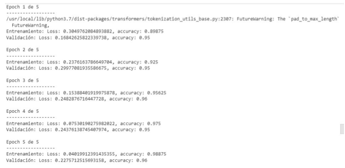 in embargo, para que BERT pudiera clasificar los Tweets, tuvo que pasar por un proceso de entrenamiento, pero ¿por qué entrenarlo? Es necesario hacerlo para que tenga un procesamiento más fluido, lo que hará de él un modelo más eficaz y eficiente por lo que los sentimientos que tiene que predecir serán más fácil de identificar, este entrenamiento se puede ver en la Figura [7], tuvieron una duración de 20 aproximadamente 40 minutos haciendo que la computadora esté activa durante al menos 2 horas para que pueda lograr el objetivo básico.