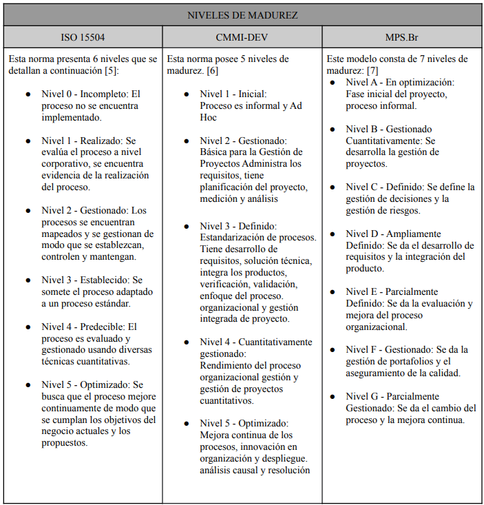 Los 3 modelos presentan una estructura parecida bajo niveles de madurez, en el caso de MPS tiene 7 niveles y en el caso de CMMI y ISO 15504 tienen 6 niveles, además en los tres casos tienen áreas de proceso muy similares que definen el estándar de calidad para la organización.