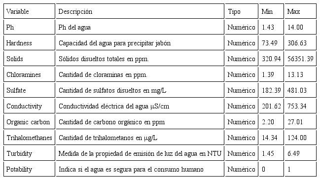 Nuestra dataset proviene de [17] en la cual analizamos la potabilidad del agua, teniendo nueve variables de entrada y tres mil doscientos setenta y siete instancias, nuestras entradas para poder obtener un correcto análisis del agua son el ph que posee de 0 a 14, hardness que es la capacidad del agua para precipitar jabón (numérico), solids que nos indica los sólidos disueltos totales (numérico), chloramines que nos dice la cantidad de cloraminas que posee en ppn (numérico), sulfate que nos muestra la cantidad de sulfatos disueltos (numéricos), conductivity que nos dice la cantidad eléctrica del agua (numérico), organic carbon que nos muestra la cantidad de carbono orgánico en ppm (numérico), trihalomethanes que nos dice la cantidad de trihalometanos en ug (numérico), y por último a turbidity que nos dice la medida de la propiedad de emisión de luz de agua en NTU (numérico). La variable a predecir o variable de salida contempla 0 para indicar agua potable y 1 para agua no potabl