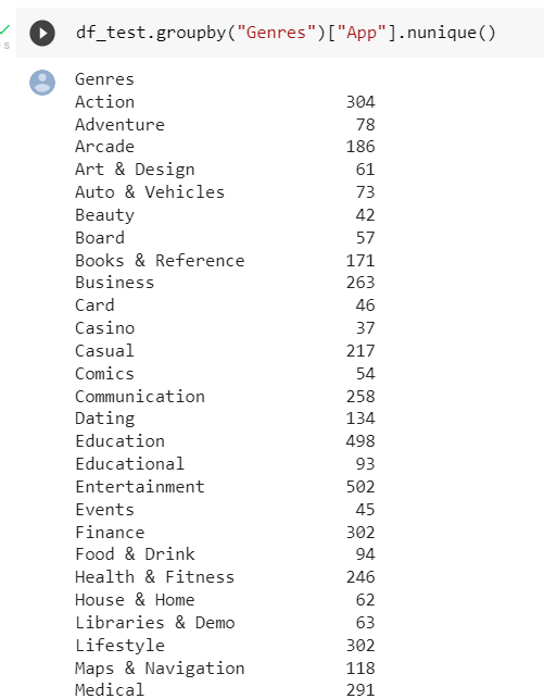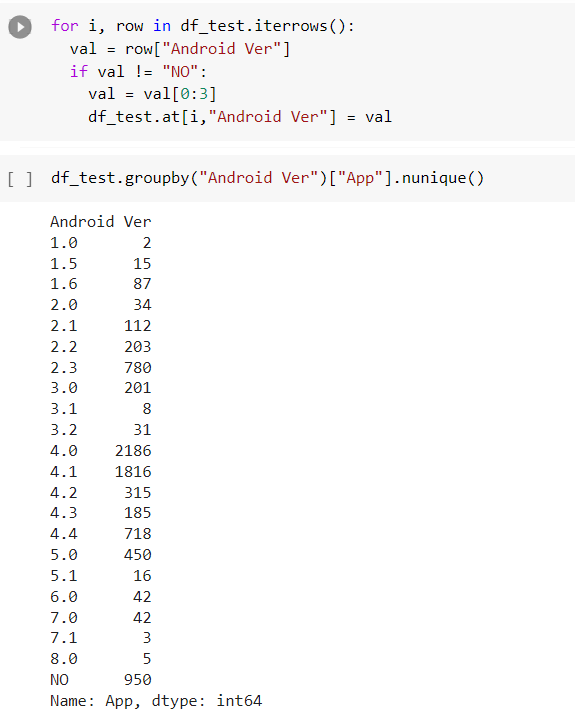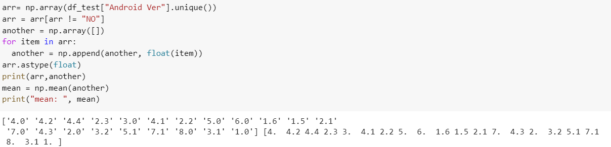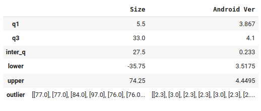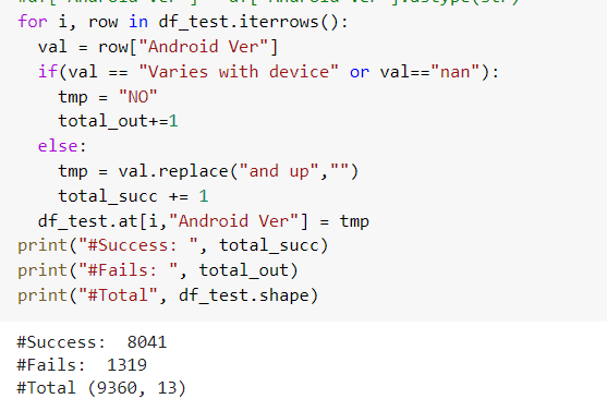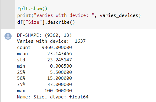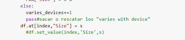 - Ahora también existe un valor no numérico “varies in device” que básicamente indica que el tamaño depende del dispositivo en el cual se instale la aplicación evaluada, debido a que no debemos indagar el peso de la aplicación en otra fuente, debemos descartar estos y para eso tenemos un else dentro del bucle que contabiliza cuantas veces se repite este valor en el campo Size de la tabla