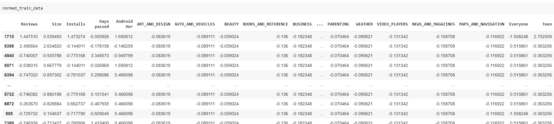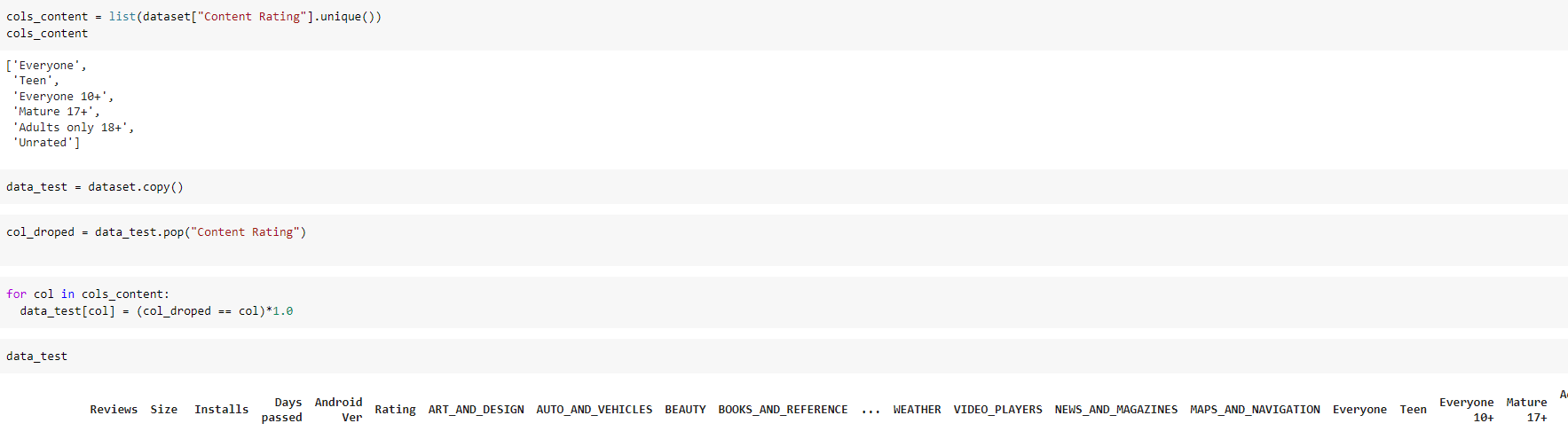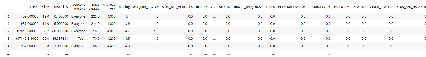 Luego de este análisis, se procedió a categorizar todos los valores como una variable en específico, es decir todos los valores categóricos han sido puestos como características propias de la Aplicación. De este modo si hay las características categóricas A,B y C, se le asigna este tipo de codificación a sus valores: