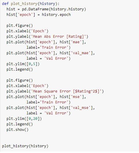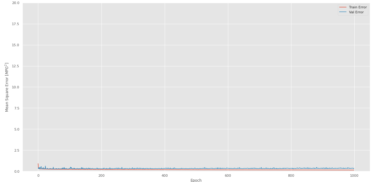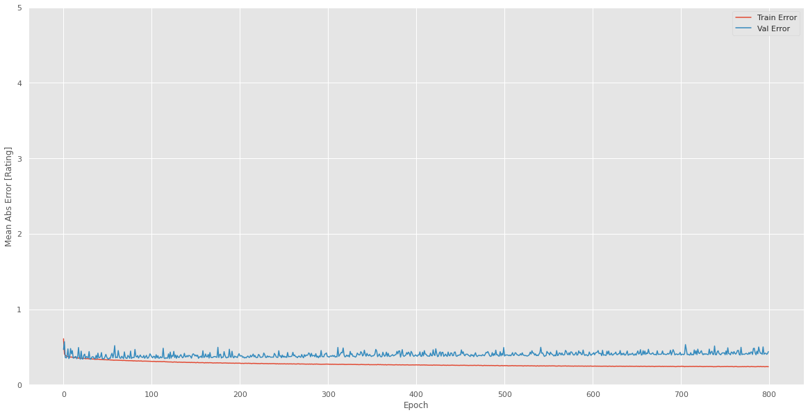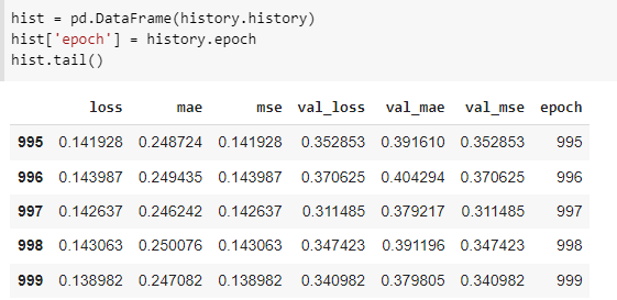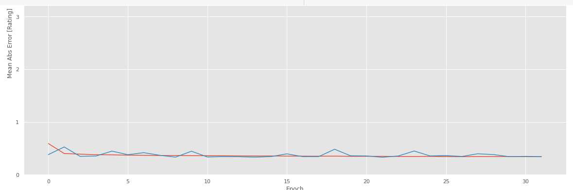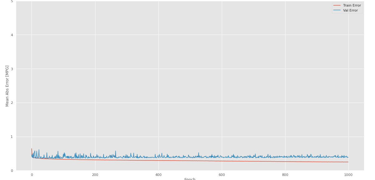 A continuación, se muestra el Mean Absolute Error con respecto a cada época, se puede ver claramente que la diferencia entre el Mean Absolute Error entre los valores predecidos y los valores verdaderos se aleja a medida que las épocas se desarrollan.