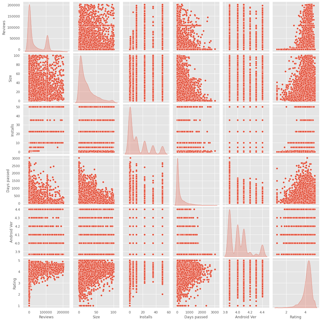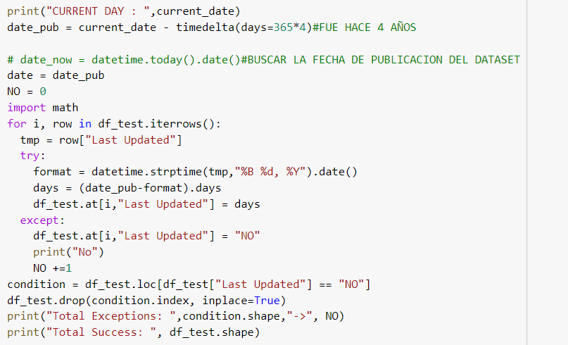 En el caso de la variable “Content Rating”,”Category”, se decidió conservar cada uno de sus datos para la codificación. Mientras que para las variables “Last Updated”, se procedió a la transformación de sus valores restando la fecha indicada en la fila y el año de publicación aproximado del dataset. La variable “Android Ver”, se transformó en un número de tipo float, debido a que el orden de precedencia de las versiones esta determinado por la posición que ocupa. Con respecto a la variable “Size”, se quitó y transformó cada valor por el sufijo que tuvo al final. Por ejemplo si el valor es “233k”, entonces esto indicaría que debemos multiplicar 233*0.001, mientras que si se tenía “233M”, se conservaría igual, en síntesis, se transformó y se puso en una misma unidad de medida en la variable “Size”. Con respecto a la variable “Installs” se transformó a números enteros y se les redimensiona a un valor general que es el valor actual entre 100,000.
