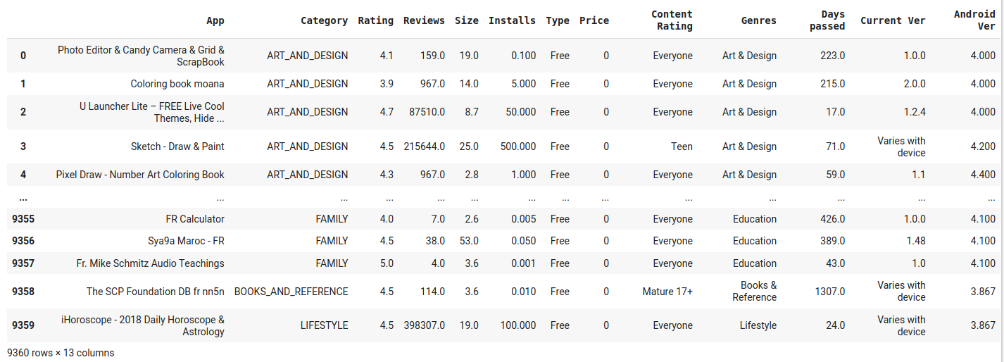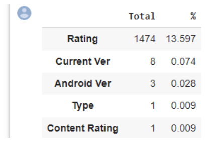 El dataset posee 13 variables (columnas) las cuales son: App, Category, Rating, Reviews, Size, Installs,Type, Price, Content Rating, Genres, Last Updated, Current Ver y Android Ver. Se cuenta con 10841 filas. Luego de la descarga del dataset se procedió al análisis para eliminar los valores missing.