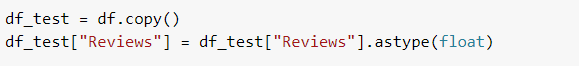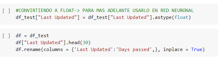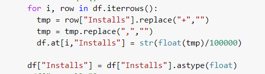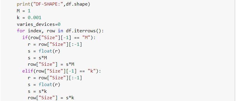 - Para arreglar los datos del campo Size debemos convertir todos sus datos a la misma base, en este caso serían kilobytes, para ello se asigna un valor para poder convertir los datos a esta base, y esta acción se repite en todas los registros de la tabla eliminando el carácter y transformando el dato en un float y reemplazandolo en la tabla.
