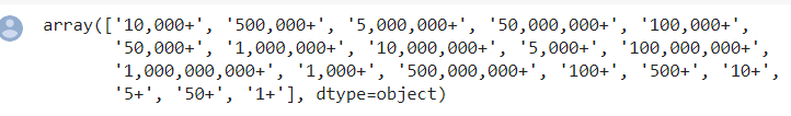 - Para arreglar los datos del campo Installs, lo que se requiere es eliminar el signo “+”, además que en algunos casos se están trabajando con números demasiado grandes, por lo que convendría reducirlos para no ocupar tanto espacio por el tamaño de los números