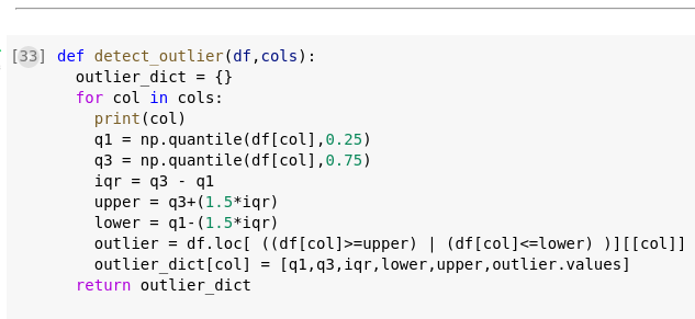 Se realizó una función que detecta outliers en las columnas del dataset (una observación anormal y extrema en una muestra estadística). Se calcula el valor iqr (Los Outliers son los puntos que caen a más de 1.5 veces el IQR, a partir de la caja) y se hallan límites superiores e inferiores, con los cuales se creará una estructura con los outliers y sus valores: