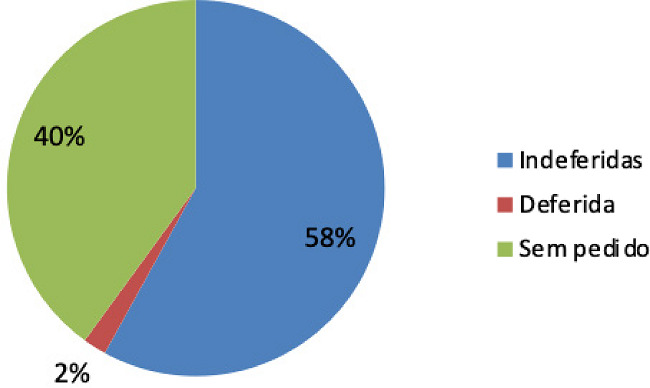 Considerando o espaço amostral de 50 (cinquenta) acórdãos selecionados para a presente pesquisa, verificou-se que em 32 (trinta e dois) houve o pedido de liminar53, sendo que: (i) foi deferida uma liminar e (ii) foram indeferidas 31 (trinta e uma) liminares, o que corresponde a 58% do espaço amostral, consoante se vislumbra do gráfico abaixo: