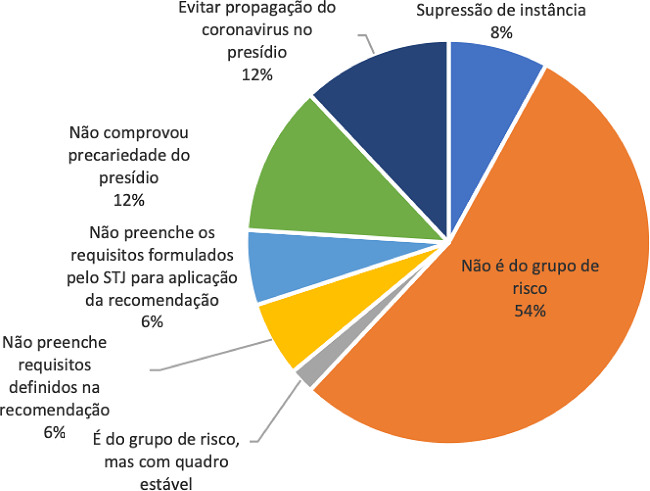 Na análise dos acórdãos que denegaram ou não conheceram a ordem de habeas corpus, foi possível identificar seis tipos de discurso: (i) o Tribunal não poderia se pronunciar sobre a incidência ou não da Recomendação nº 62/2020, do CNJ, sob pena de supressão de instância (4); (ii) o paciente não se encontrava inserido no grupo de risco de contaminação do coronavírus (27); (iii) o paciente pertencia a um grupo de risco, mas com quadro de saúde estável (1); (iv) o paciente não preenchia os requisitos para concessão da liberdade provisória segundo a Recomendação nº 62/2020, do CNJ (3); (v) no caso concreto, não estavam preenchidos os requisitos formulados pela jurisprudência para aplicação da Recomendação nº 62/2020 do CNJ (3); (vi) ausência de comprovação quanto à precariedade do estabelecimento prisional para o enfrentamento da pandemia ou outra situação excepcional (6).