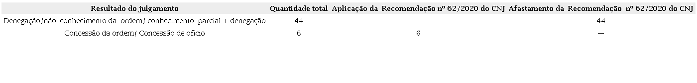 Em todos os casos selecionados para compor o espaço amostral da presente pesquisa empírica, o Superior Tribunal de Justiça foi provocado a se manifestar sobre a aplicação do teor da Recomendação nº 62/2020 do CNJ no que tange à possibilidade de reconhecimento da excepcionalidade da prisão preventiva com a consequente soltura do paciente. Dentre os acórdãos que denegaram ou não conheceram a ordem de habeas corpus, em 44 (quarenta e quatro), as diretrizes estabelecidas pela Recomendação em epígrafe foram expressamente afastadas pelo Tribunal. De outro lado, verificou-se que nas decisões em que houve a concessão da ordem, em 06 (seis) houve a aplicação da Recomendação nº 62/2020 do Conselho Nacional de Justiça.