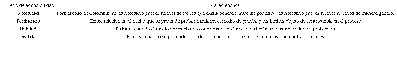 Con todo, el juicio de admisibilidad probatoria, no es más que el resultado de un juicio que realiza el juez sobre las condiciones del medio o actividad probatorios que se proponen para su admisión en el proceso penal. En ese sentido, deberá establecerse si se cumplen los requisitos de necesidad, pertinencia, utilidad, y legalidad.