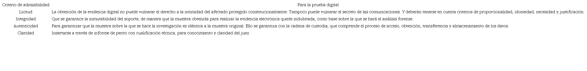 Adicionalmente, Magro Servet, magistrado del Tribunal Supremo de España, describe que para admitir la evidencia digital se deben cumplir los criterios que se presenta en la Tabla 3.