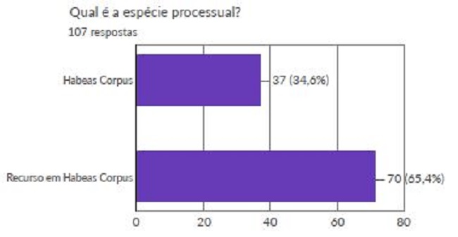 No que se refere ao tipo de processo, observou-se que a maioria dos acórdãos analisados são de RHC, representado 65,4% dos julgados analisados. Os HC representaram 34,6%, o que sugere a efetivação da jurisprudência defensiva do STJ em relação a não aceitar HC substitutivo de RHC.