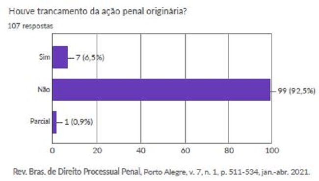 Buscou-se também saber se dentre os julgados houve trancamento da ação penal. Em 92,5 % dos acórdãos não ocorreu o referido trancamento do processo penal, por fundamentos que serão analisados no tópico terceiro deste estudo.