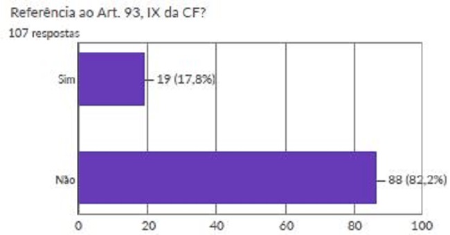 Depois, investigou-se se nos julgados houve citação do comando normativo constitucional do art. 93, IX da CF. Em 82,2% dos acordãos analisados não houve qualquer menção à obrigataoriedade da fundamentaçao das decisões.