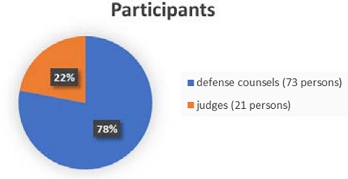 The survey was conducted in an online format, utilizing an activation link distributed to judges and defense counsels through the National School of Judges and the Ukrainian Bar Association. This method of dissemination aimed to mitigate the risk of unsolicited responses, such as trolling. It is important to note that while the survey ensured anonymity, there was a potential for individuals outside the intended target group to complete the survey. The survey questionnaire consisted of 17 open-ended and seven closed multiple-choice questions. Participants had the option to complete the survey in either Ukrainian or Russian, with the questions presented in Ukrainian after being translated from English by associates of the Sunflowers Project Foundation. Only questions regarding the type of legal profession practiced and the date of starting the profession were mandatory. Data collection took place between April 20 and May 9, 2023, resulting in a total of 94 participants, including 21 judges and 73 defense counsels (Table 1).