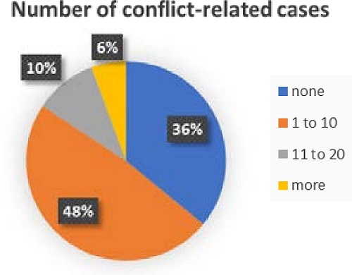 Among the respondents, it was found that nearly a third had no experience with conflict-related crimes, while the largest segment of participants had fewer than a dozen such cases (43 individuals). An illustrative example was provided by a respondent who, as a judge, highlighted the consequences of regional occupation and the resulting restructuring of court activities. This respondent initially handled only three conflict-related cases following the 2014 aggression, but the number surged to around 500 cases following the occupation of Kharkiv in 2022. This demonstrates the profound influence of territorial and jurisdiction changes on the judicial workload.