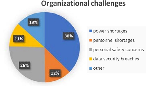 When asked to identify the biggest organizational challenges, respondents identified power shortages (38%) as the most problematic. While courts in Ukraine are recognized as part of the country’s critical infrastructure and receive support from governmental and local authorities (albeit insufficiently, as indicated by respondents), their functioning has heavily relied on the self-reliance of staff members. Remarkably, two survey participants mentioned that they personally acquired power generators to mitigate the impact of power outages.