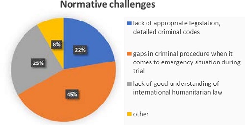 Moreover, respondents confirmed (22%) that a normative challenge is the lack of appropriate legislation, including detailed criminal codes. As indicated above, legislative shortcomings, including in particular the expected adoption of the War Crimes Bill, are burdensome in practice and awaited by the judiciary.