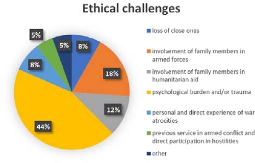 In response to inquiries regarding ethical challenges encountered in the practice of their profession, the respondents indicated the relevance of individual factors as follows. The most frequently mentioned concerns included the psychological burden and potential trauma experienced by individuals (44%). Additionally, a significant number of respondents reported the involvement of their family members in the armed forces (18%) or humanitarian aid efforts (12%). Furthermore, a notable number of respondents expressed the loss of close acquaintances (8%), personal and direct exposure to war atrocities (8%), as well as prior service in armed conflict and direct engagement in hostilities (5%).