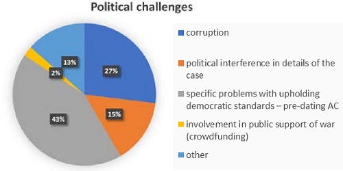 The final set of factors falls within the category of political challenges, as they pertain to the public sphere and governance in Ukraine. These challenges encompass concerns regarding the impact of the executive branch and public opinion on the judiciary, as well as the normative framework that governs its operations. Furthermore, this group sheds light on the perspective of defense counsels and the obstacles they encounter in fulfilling the right to a fair trial and providing effective legal representation.