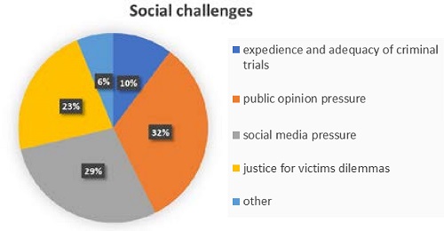 In third position, 23% of the participants identified justice for victims dilemmas as a social challenge. Furthermore, a social challenge highlighted by 10% of the respondents pertains to the expediency and adequacy of criminal trials. These two identified factors are closely intertwined. On the one hand, victims have the right to receive an appropriate response to address their needs, including the identification and adjudication of those accountable for the harm they have endured. Conversely, protracted trials, trials conducted in absentia, deficiencies in the proper classification of crimes, and subsequently insufficient sanctions exacerbate the plight of the victims. Simultaneously, excessively expedited or perfunctory trials undertaken to appease public sentiment raise concerns regarding the adherence to due process. In Ukraine’s situation, the significant volume of conflict-related investigations and short timeframe between the onset of full-scale aggression and the first convictions (first one delivered within three months)73 prove that justice for victims is an important consideration.