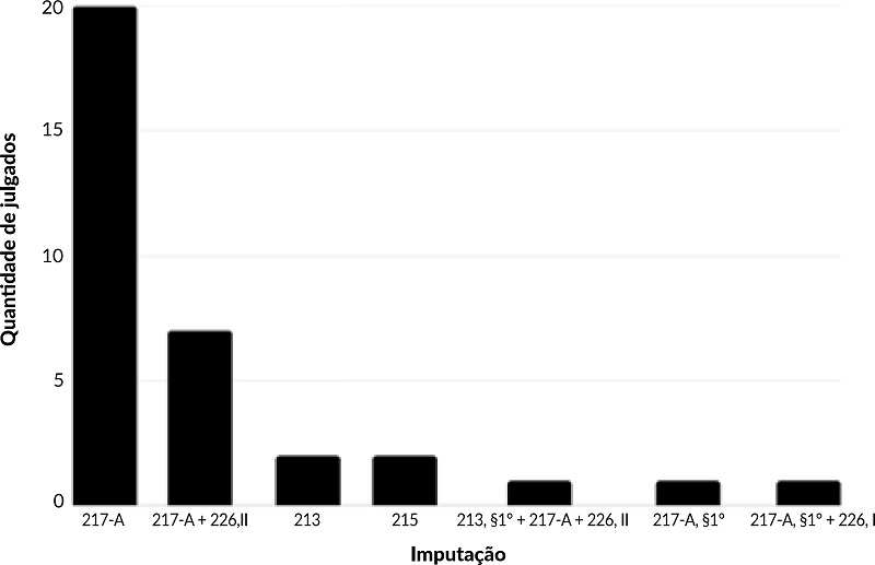 O primeiro critério de sistematização aplicado aos 34 (trinta e quatro) acórdãos foi o crime imputado. A justificativa para tanto é que, conforme explicado no tópico 2, o valor da palavra da vítima em crimes sexuais apresenta ainda maiores dificuldades nos casos em que a vítima é criança. Desse critério resultaram: (a) 20 (vinte) julgados com a imputação era de estupro de vulnerável previsto no artigo 217-A do Código Penal; (b) 7 (sete) julgados imputaram o crime de estupro de vulnerável (artigo 217-A, CP) cumulado com a causa de aumento de pena por relação familiar (artigo 226, II, CP); (c) 2 (dois) julgados com imputação de estupro, previsto no artigo 213, CP; (d) 2 (dois) julgados com imputação de violência sexual mediante fraude (artigo 215, CP); (e) 1 (um) caso cuja imputação era o crime previsto no artigo 213, § 1º (estupro vítima entre 14-18 anos) e 217-A (estupro vítima de vulnerável) cumulada com a causa de aumento de pena por relação familiar (artigo 226, II, CP); (e) 1 (um) julgado de estupro de vulnerável previsto no artigo 217-A, § 1º do CP; e (f) 1 (um) julgado cuja imputação era de estupro de vulnerável (artigo 217-A, §1º, CP) cumulada com causa de aumento de pena por concurso de agentes (artigo 226, I, CP). Essas informações podem ser apresentadas por meio do seguinte gráfico: