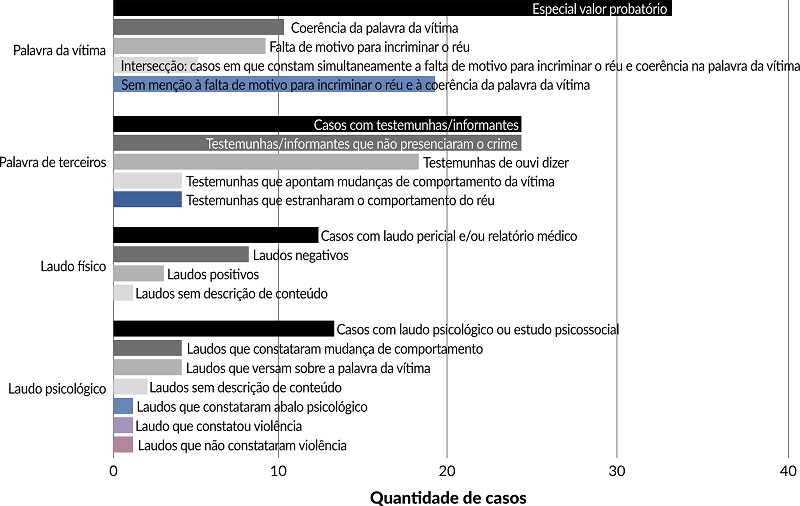 A segunda refere-se à categoria palavra de terceiros. Em um caso64, apesar de constar na descrição das provas que há testemunhas, não há referência ao conteúdo do que foi dito, de modo que não foi possível contabilizá-lo em nenhum dos três grupos (testemunhas de ouvir dizer; testemunhas que apontaram mudança de comportamento da vítima; e testemunhas que estranharam o comportamento do réu).