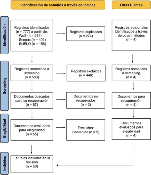 El proceso comenzó con la identificación de registros a partir de los índices seleccionados (n = 777). Al realizar cada búsqueda se exportó un archivo con los resultados, los cuales fueron ingresados manualmente a una hoja de cálculo de Microsoft Excel donde se realizó un cotejo y posterior depuración de los resultados13. De esa manera, se eliminaron registros repetidos o duplicados (n = 274).