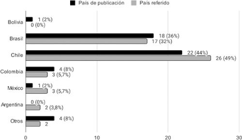 De la mano de lo anterior, indagamos sobre los lugares de publicación y los países a los que dichas publicaciones se refieren. Para efectos de lo primero, identificamos la nacionalidad de la revista o texto publicado. El universo de trabajos en este punto son los 50. Para lo segundo, en nuestro análisis de contenido de los textos identificamos al o los países que eran abordados de manera preferente por la publicación. De esta forma, el universo se incrementó a 53 ya que algunos trabajos abordaron en su análisis a más de un país de manera principal. Debemos aclarar que no consideramos para estos efectos los textos que a modo ejemplar o referencial mencionaban evidencia o situaciones de otros países de la región. Para ser considerado como un “país referido”, la publicación debía contar con una orientación preferente de análisis de este. La figura 3 resume los resultados de ambas indagaciones.
