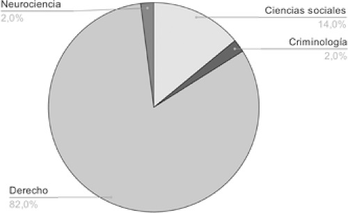 Las publicaciones se distribuyen en sólo cuatro áreas disciplinares, pero con una fuerte concentración en el ámbito del Derecho (41 que representan un 82% del total). Muy por lejos están textos que pertenecen a otras Ciencias Sociales con un 14% (siete) y luego con un 2% a la criminología y la neurociencia. En el ámbito de ciencias sociales incluimos diversas disciplinas, entre las que hay tres publicaciones (6%) provenientes de la psicología, dos de ciencias policiales y otras dos de políticas públicas, representando un 4% cada una.