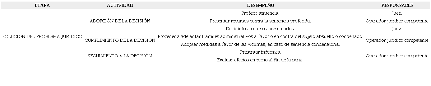 Y como un aporte adicional, el cumplimiento requiere seguimiento a través del tiempo; no basta con tomar las decisiones por una única vez, sino que es necesario asegurar que se mantengan adecuadamente durante el tiempo que haya dispuesto la sentencia. Por lo mismo, la presentación de informes periódicos es fundamental, para efectos de asegurar en última instancia que se cumplen los efectos esperados para la pena impuesta o la absolución sentenciada. Es de anotar que cada sistema jurídico le otorga un fin distinto a la pena, entre los cuales se encuentra la resocialización del condenado, la reparación de la víctima, la erradicación del ilícito, el castigo conmutativo, entre otras muchas posibilidades acordadas por cada Estado en particular16. Siendo así, la solución del problema jurídico se da en la medida en que el fin de la pena sea satisfecho y en ese punto se evidencia que no basta solo con una sentencia, sino que se requiere del seguimiento de su cumplimiento. Estas actividades humanas son sistematizadas genéricamente a Tabla 3 (actividades humanas de la etapa de solución del problema jurídico).