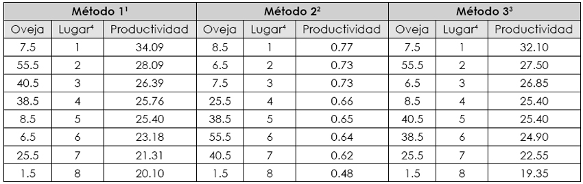 En la Tabla 1 se presentan y ordenan de mayor a menor los valores de productividad de las ovejas considerando el método para su determinación. La oveja 7.5 apareció en alguna de las tres primeras posiciones de mayor productividad en los tres métodos estudiados, mientras que las ovejas 55.5 y 6.5 aparecieron en alguna de las tres primeras posiciones en dos de los tres métodos. Por otra parte, las ovejas que tuvieron los valores de productividad más bajos fueron las ovejas 1.5 (en los tres métodos) y la 25.5 (en dos de los métodos utilizados).