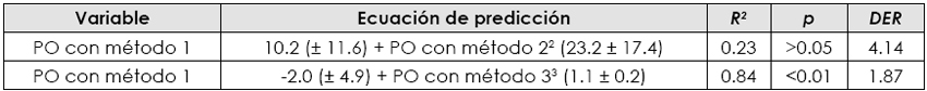 Si se parte del supuesto de que el método 1 es el más apropiado para determinar la productividad de una oveja por incluir en su determinación el intervalo entre partos (evidencia de la capacidad de la hembra para mantener un proceso productivo en al menos dos partos subsecuentes) y el peso de la camada (evidencia de la capacidad productiva de una hembra en una lactancia) se procedió a determinar la relación entre la productividad de las ovejas obtenida con el método 1 con la de los métodos 2 y 3, para ello se utilizó el procedimiento de regresión simple, donde la variable dependiente fue la productividad de las ovejas y la variable independiente la productividad de las ovejas con los métodos 2 y 3. La ecuación de predicción propuesta fue la siguiente: