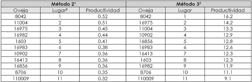 En la Tabla 3 se muestra la productividad de las ovejas Pelibuey obtenida con los métodos 2 y 3. En el límite superior se detectó coincidencia entre los dos métodos: las ovejas 8042, 11004 y 16975 fueron las que tuvieron mayor productividad. Sin embargo, en el límite inferior solo se detectó coincidencia en dos de las tres ovejas que ocuparon los tres últimos lugares en productividad.