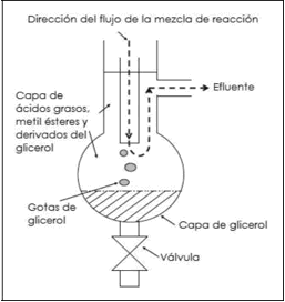 Hama et al. (2013) desarrollaron un reactor de lecho empacado (PBR, por sus siglas en Inglés) para la obtención de biodiesel a partir de aceite residual de cocina. El reactor consiste en un tubo de acero inoxidable empacado con lipasa inmovilizada, en el cual se introduce la mezcla de reacción usando una bomba de diafragma; además cuenta en su parte inferior con un sistema de separación por decantación. Esto se puede ver en la Figura 2.