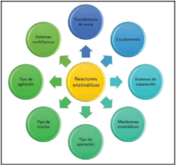 Se han considerado las variables de la Figura 4 por las razones expuestas a continuación. La primera se refiere a que la transferencia de masa implica el buen mezclado, ya que en ocasiones se tienen sistemas multifásicos o la inclusión de un sistema de agitación que no desnaturalice a las enzimas. Después, el tipo de reactor puede ser de tanque o tubular; el primero es más sencillo de utilizar pero el segundo es más recomendable para el escalamiento. Dependiendo de las necesidades el tipo de operación puede ser continua o por