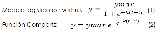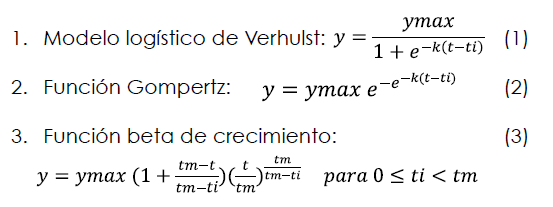 Donde (y) Variable dependiente; (ymax) Valor máximo de y; (k) Constante de curvatura del modelo; (t) Tiempo (variable independiente); (ti) Tiempo de inflexión; (t m) Tiempo máximo y (e) Número de Euler.