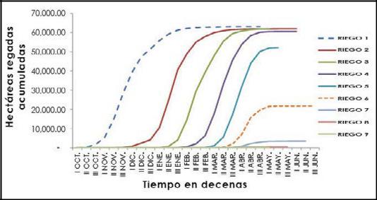 Al graficar la información de la superficie regada acumulada de la Tabla 1 se obtiene una serie de curvas de tipo sigmoideo, como se aprecia en la Figura 1.